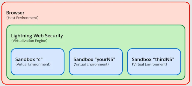 Lightning Web Security (LWS), at its core, utilizes the principle of virtualization to transform the browser into a controlled host environment. In this role, LWS functions as the virtualization engine, responsible for managing and regulating the virtual environments, specifically the namespace sandboxes. Within these sandboxes, each component is granted restricted access to specific resources, including global objects, network access, cookies, and other relevant elements. This approach ensures a secure and controlled interaction of components within the Salesforce ecosystem.