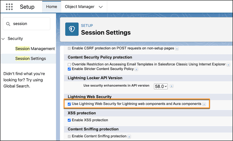 3. On the Session Settings page, choose "Use Lightning Web Security for Lightning web components and Aura components" and save your changes.